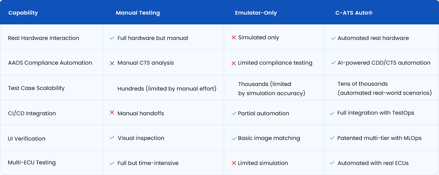 Backed by 10 years of large-scale deployment across top-tier OEM IVI programs, C-ATS enables automated, real-vehicle bench-based testing at scale. In these environments, IVI systems interact with multiple ECUs, vehicle buses (CAN/LIN/Ethernet), audio systems, displays, and peripherals, enabling automation coverage across tens of thousands of IVI test cases. This bench-first approach validates the complete system integration that vehicles actually experience—something emulator-only solutions cannot achieve.